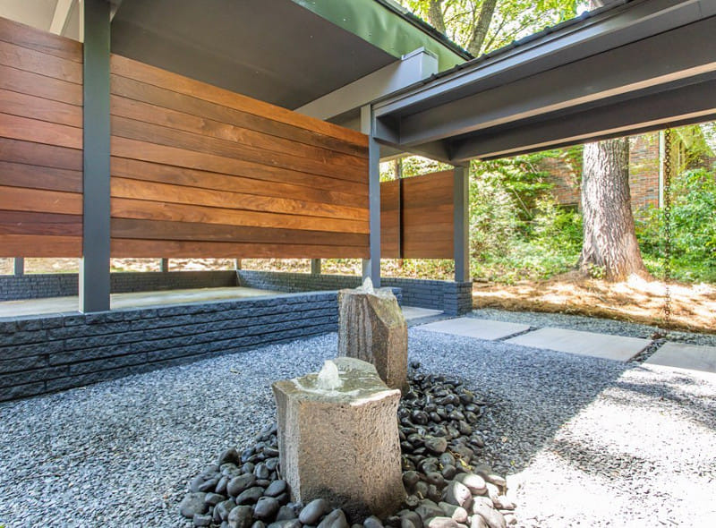 Small zen garden design doesn't usually have a bench or a statue because people usually enjoy the view from the outside of the gardens.