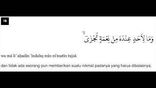 This is chapter 92 of the noble quran. Quran recitation by abdul hadi kanakeri, english translation of the quran by yusuf ali and tafsir by sayyid abul ala. It contrasts two types of people, the charitable and the miserly, and describes each of their characteristics. Surat ini terdiri atas 21 ayat dan termasuk dalam golongan surat makkiyah. Baca juga surat al lail teks arab, terjemah bahasa indonesia dan bahasa inggris.