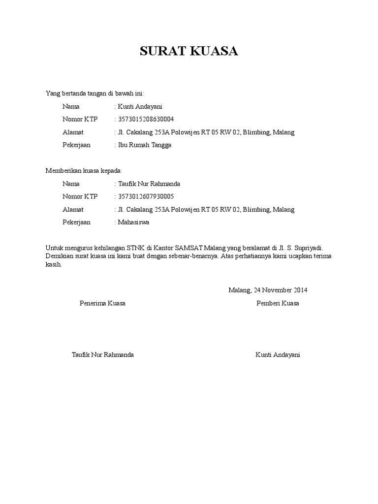 contoh surat kuasa perpanjangan stnk from imgv2-2-f.scribdassets.com Perpanjang stnk anda ketika masa berlakunya hampir habis agar anda tetap merasa nyaman saat berkendara. Demikian contoh surat kuasa perpanjangan stnk yang bisa kami bagikan di blog sederhana ini. Namun jika anda tidak ingin repot, maka bisa menunjuk orang lain mengurusnya dan menggunakan contoh surat kuasa perpanjang stnk di bawah ini. Dan jika diperlukan anda bisa membawa juga sura kuasa untuk perpanjang stnk dari pemilik asli. Yang bertanda tangan di bawah ini : .mengurus perpanjangan surat tanda nomor kendaraan (stnk) merupakan sebuah kegiatan yang amat sangat membosankan, karena setiap berikut ini adalah beberapa informasi terkait dengan syarat perpanjangan stnk yang bisa bermanfaat untuk anda yang ingin memperpanjang surat. Dengan menggunakan surat kuasa ini maka tidak akan ada keraguan terhadap si penerima kuasa karena telah memiliki bukti perintah resmi. Surat kuasa adalah surat yang isinya mengenai pemberian wewenang atau kuasa dari seseorang atau satu pihak kepada orang lain atau pihak lain untuk melakukan suatu hal seperti yang tertera dalam isi surat.